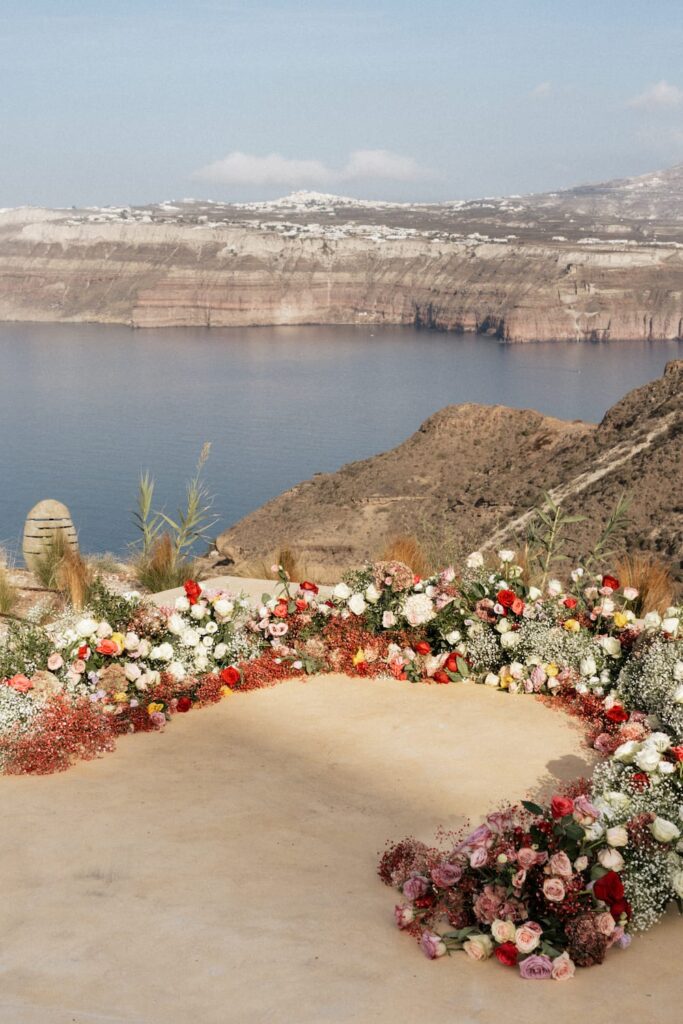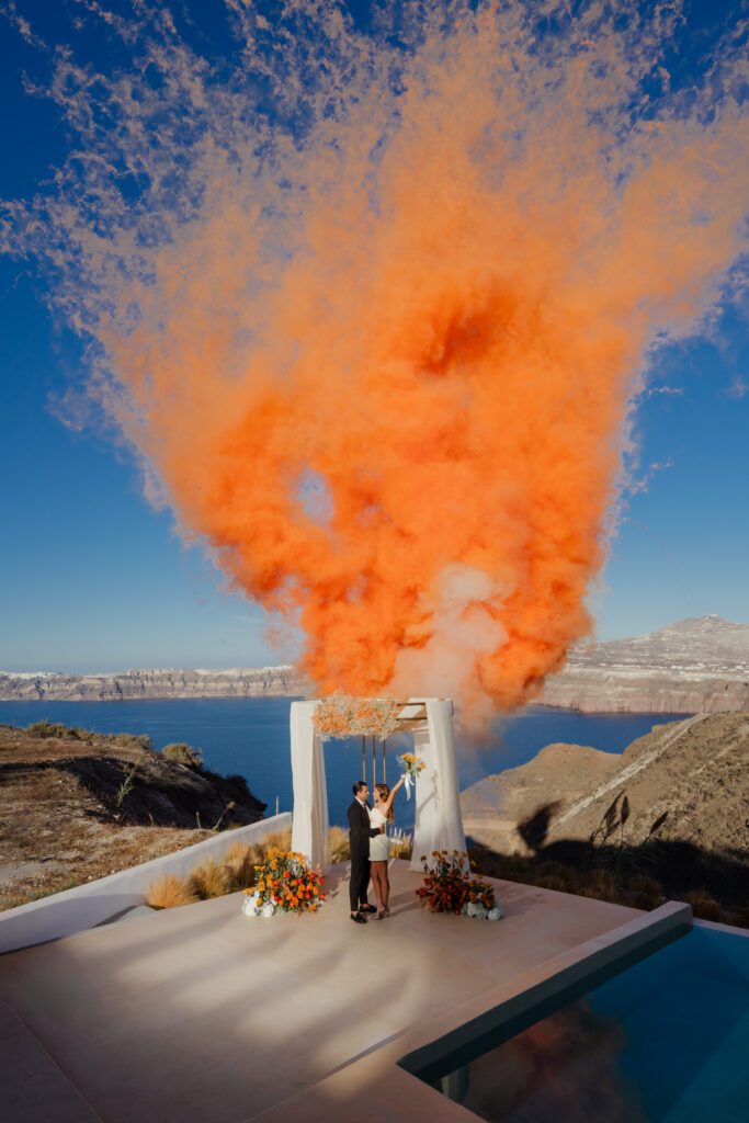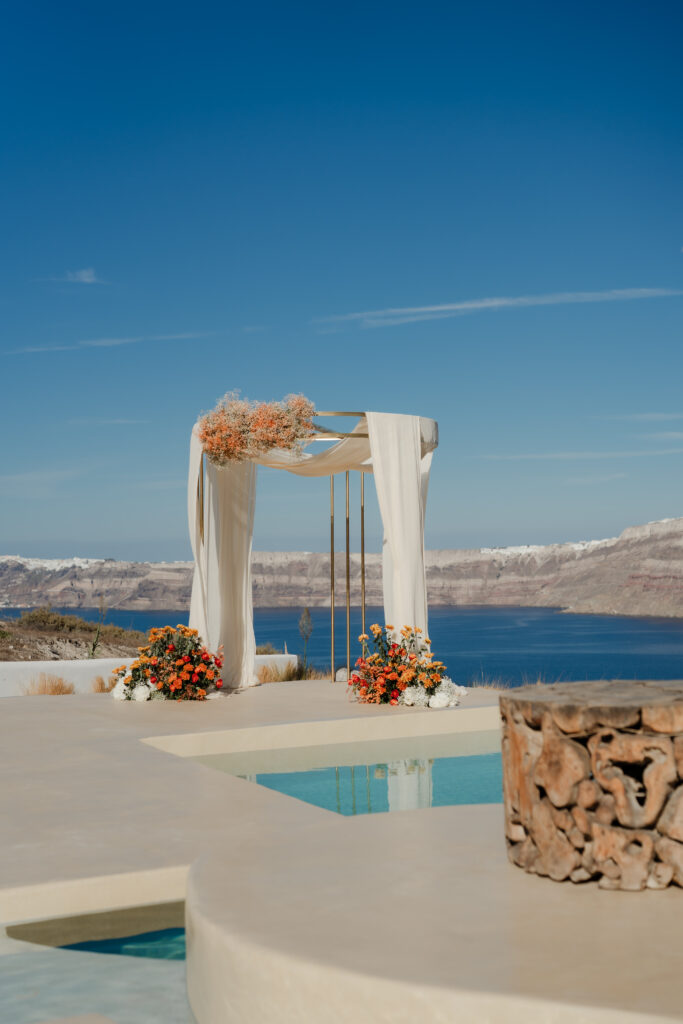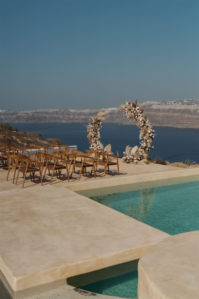 As the bride, you will likely be a hotel guest in the main Villa with the ultimate privacy and luxury before the event or you arrive by vehicle in your wedding dress moments before the ceremony for a dramatic entrance. The ceremony itself, in addition to the Caldera view sitting behind the ceremony, will host chairs and ceremony arch that are beautifully decorated in your choice of artificial or fresh floral arrangements with the help and appointment of a local and talented florist.